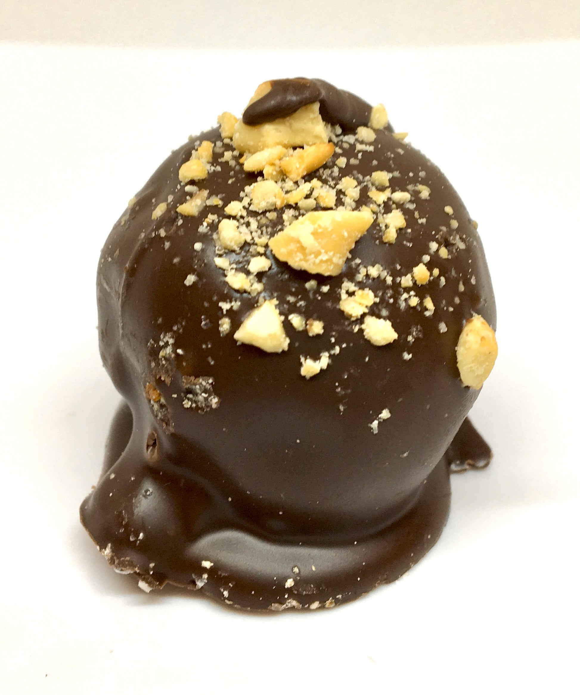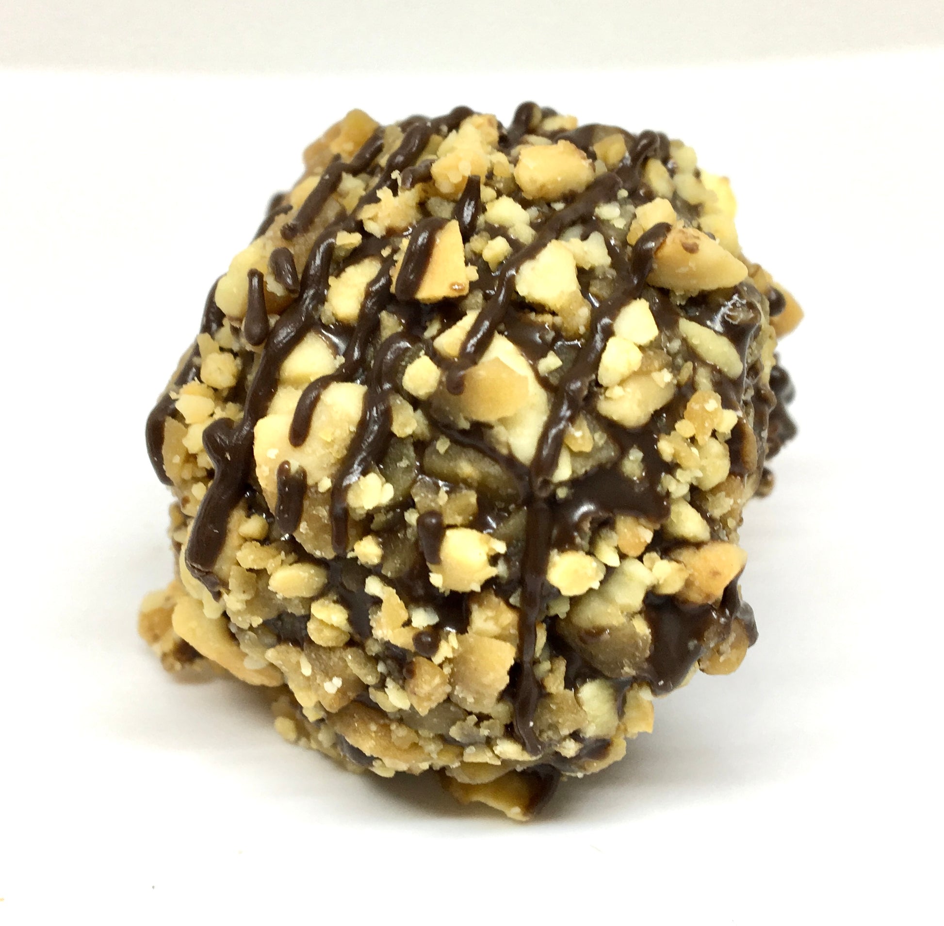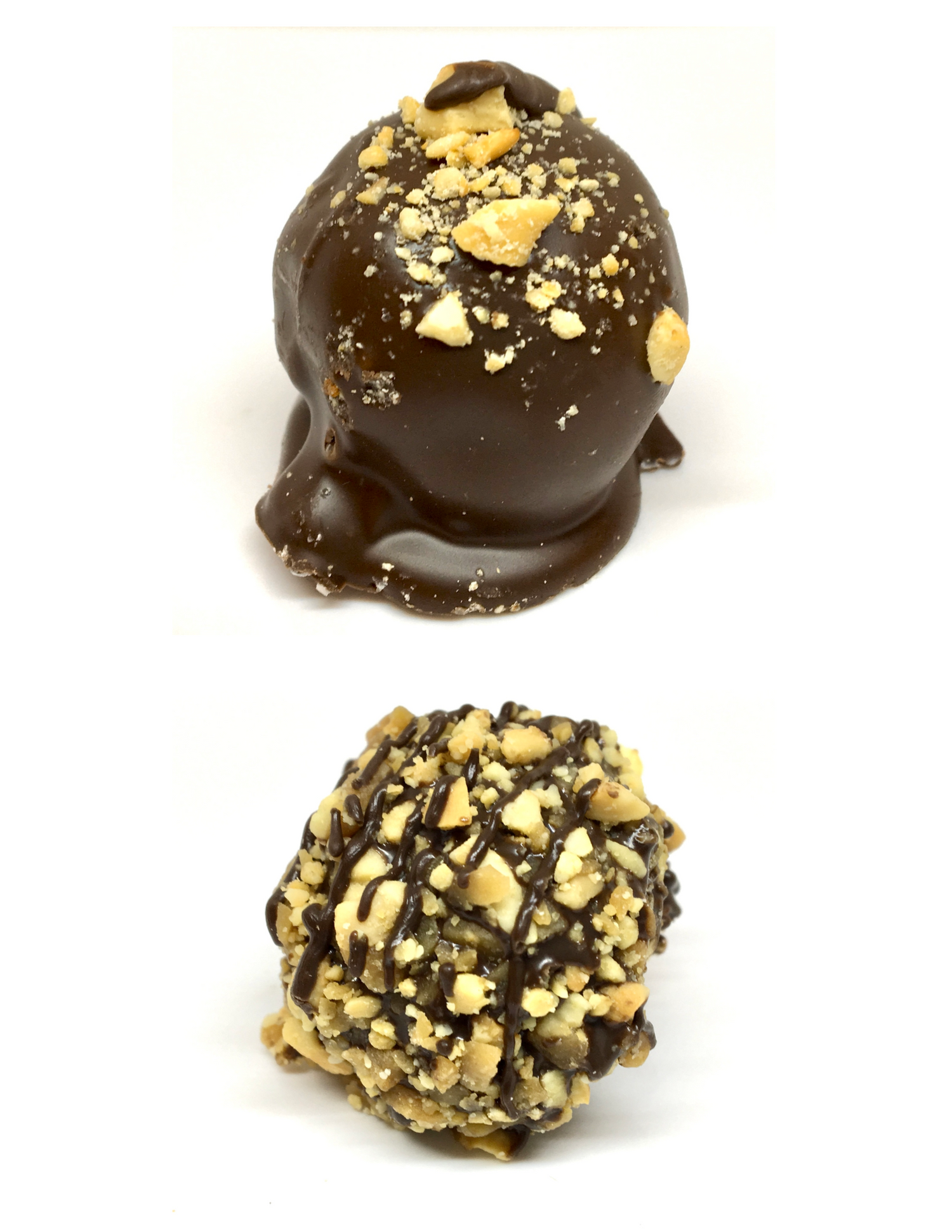 Made from whole, roasted and salted cashews, our Bare Naked Cashew Brittle Bonbons come with either a "smooth" or "crunchy" shell. The "smooth" bonbons are double-dipped in dark chocolate and topped with a dusting of crushed cashew. The "crunchy" bonbons are dipped once in dark chocolate, then rolled in crushed Bare-Naked Cashew Brittle, and finished with a fine dark chocolate drizzle.