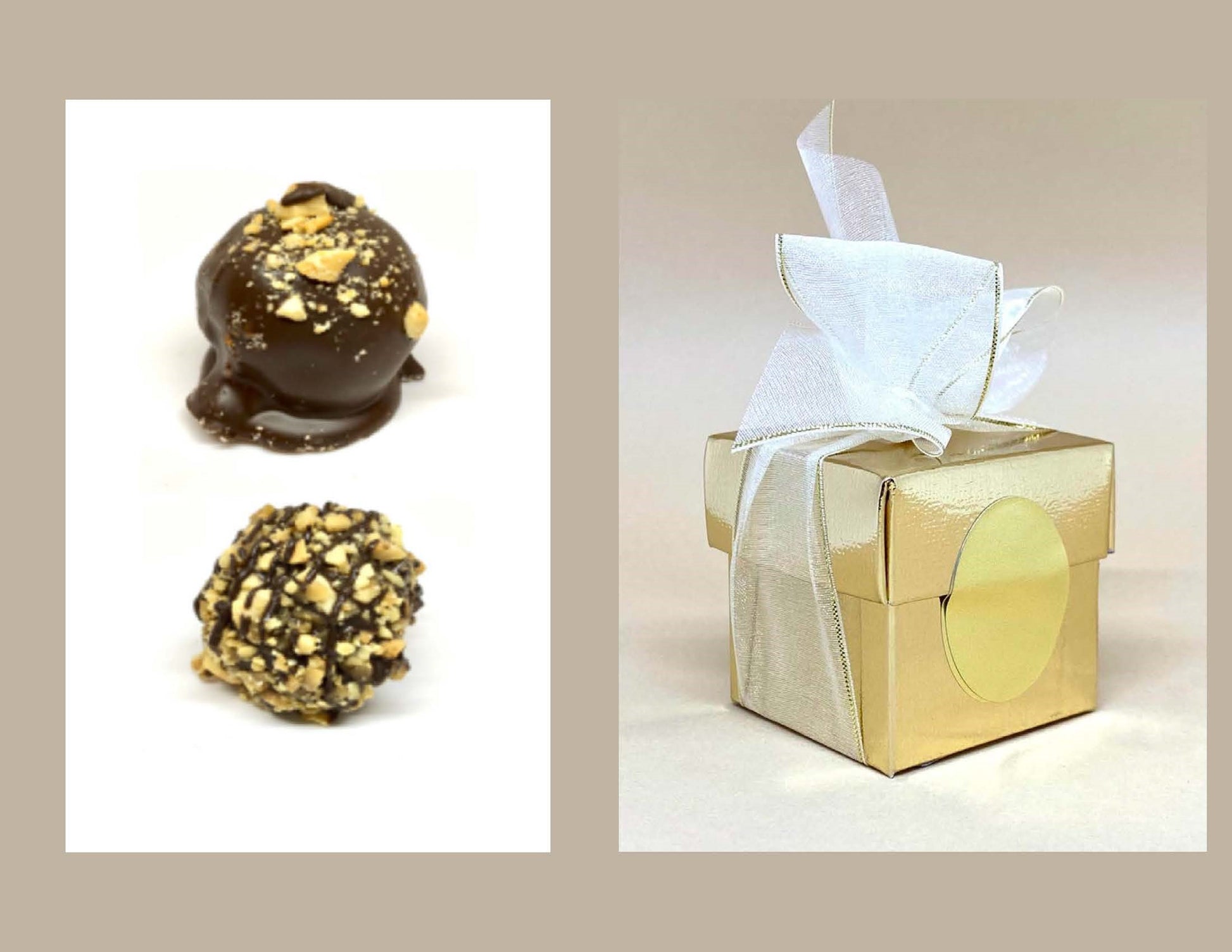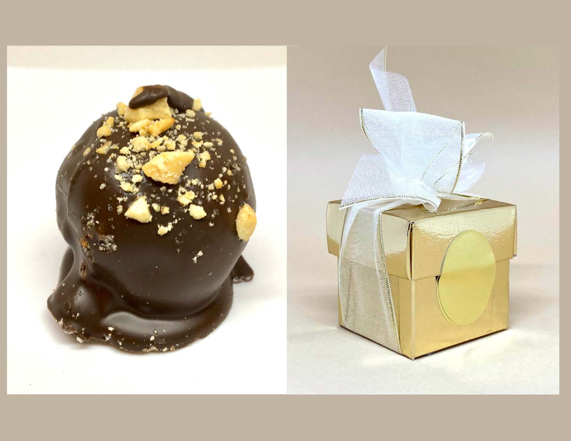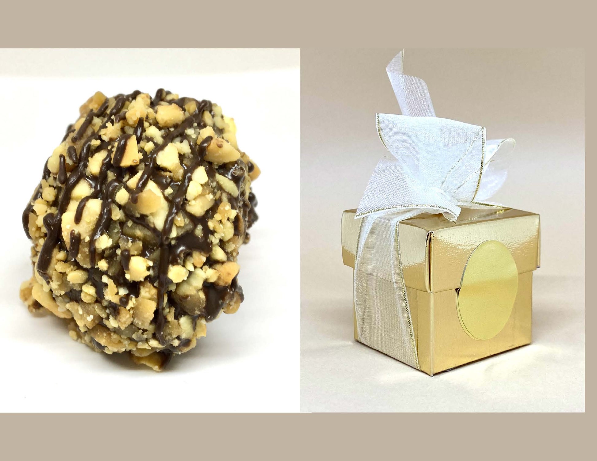Made from whole, roasted and salted cashews, our Bare Naked Cashew Brittle Bonbons come with either a "smooth" or "crunchy" shell. The "smooth" bonbons are double-dipped in dark chocolate and topped with a dusting of crushed cashew. The "crunchy" bonbons are dipped once in dark chocolate, then rolled in crushed Bare-Naked Cashew Brittle, and finished with a fine dark chocolate drizzle.