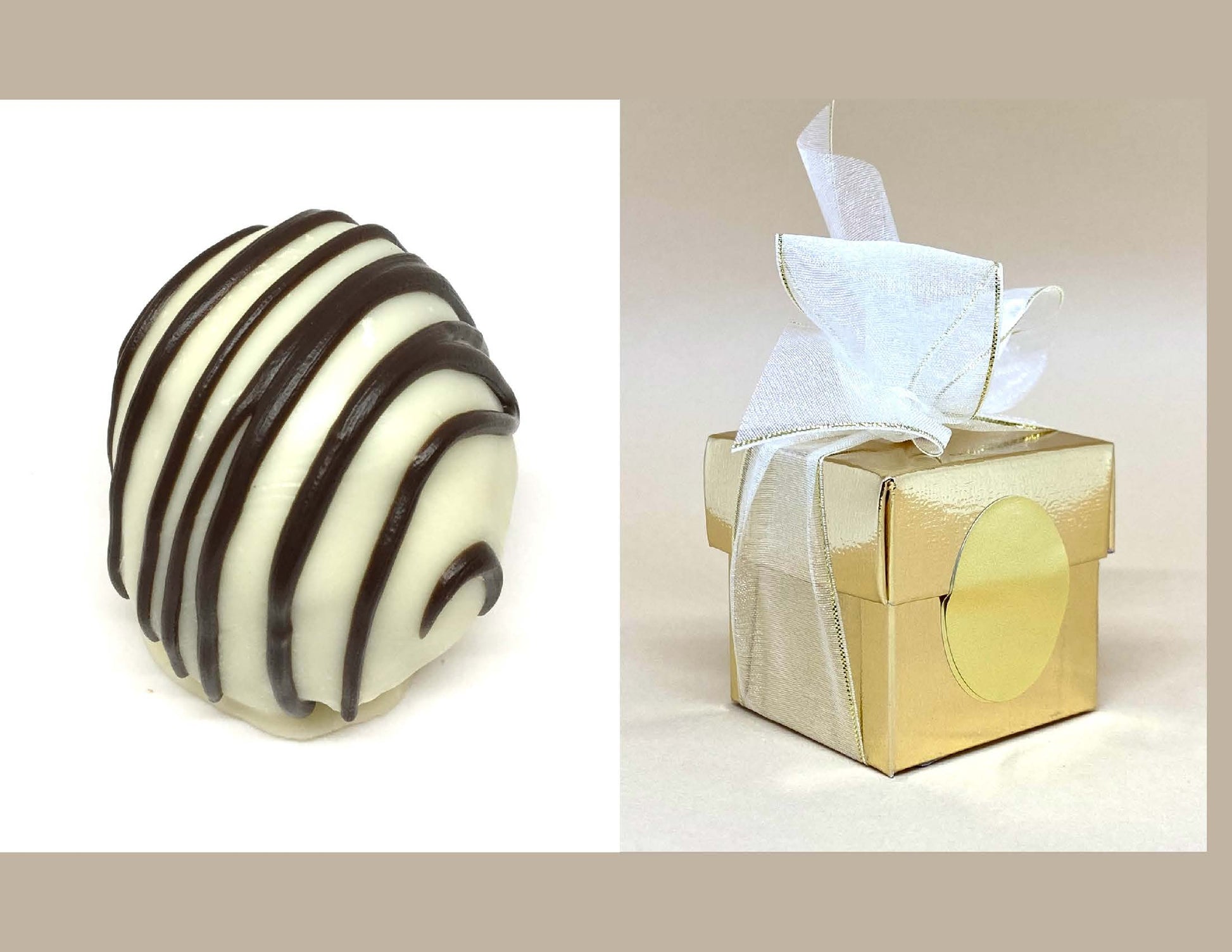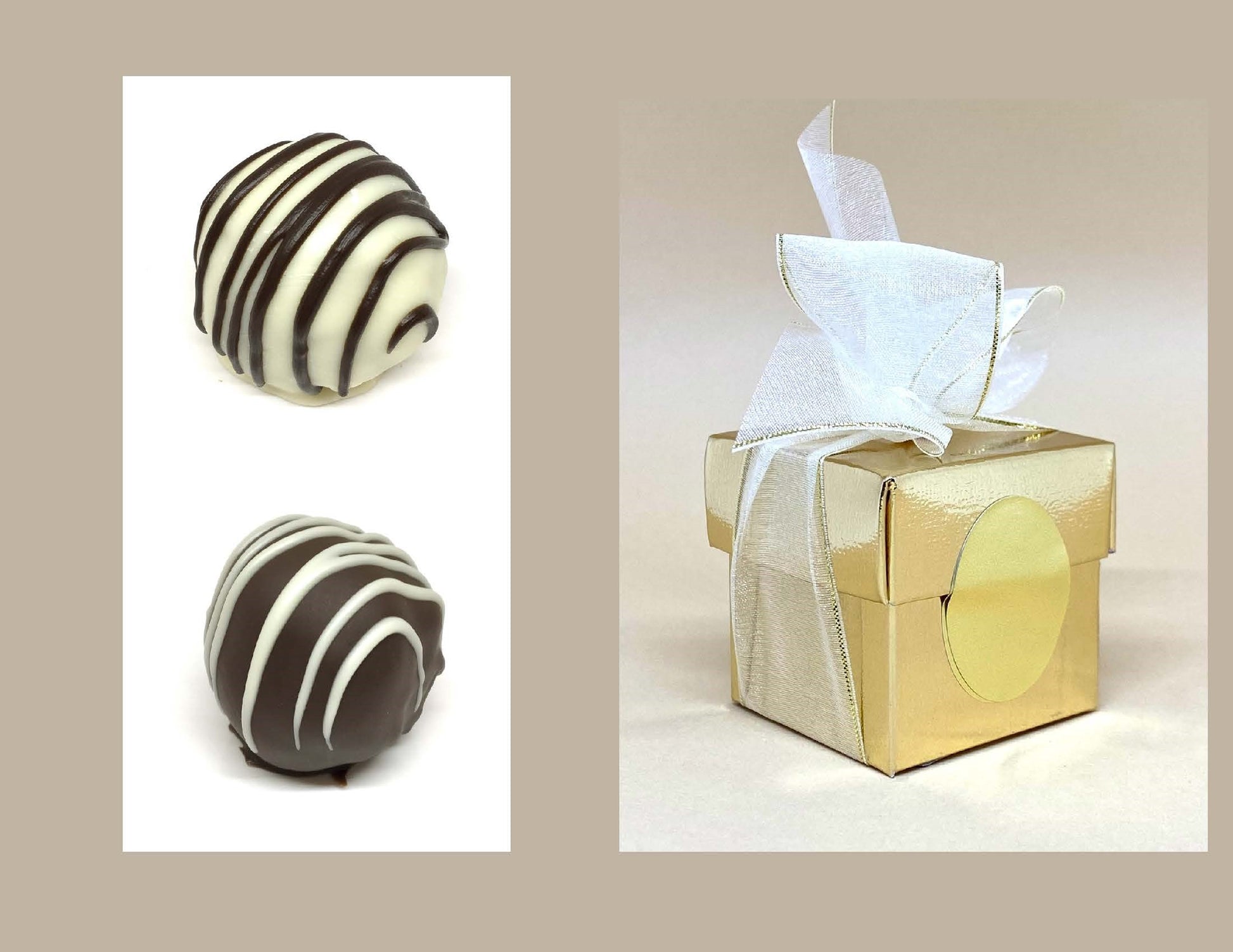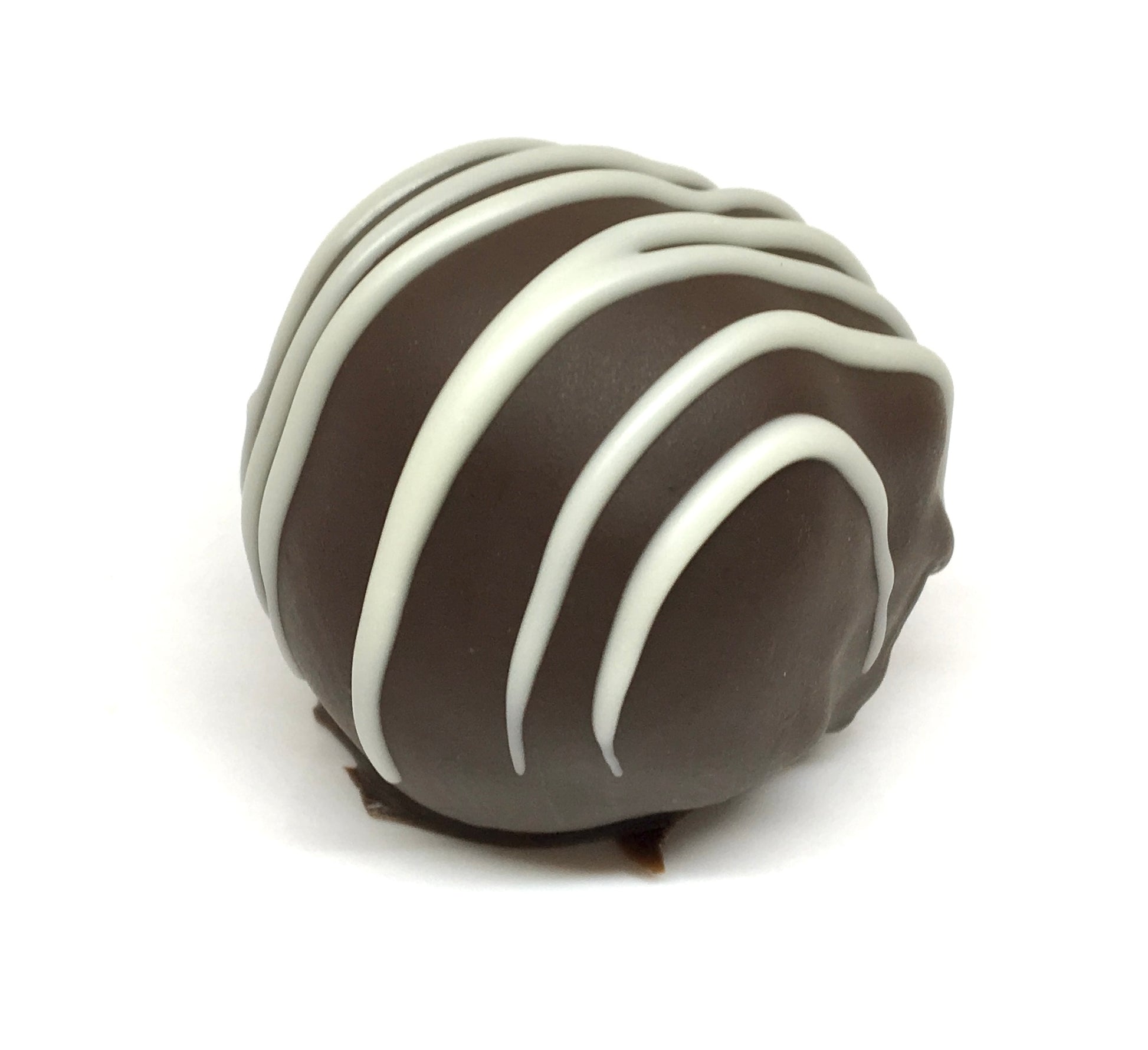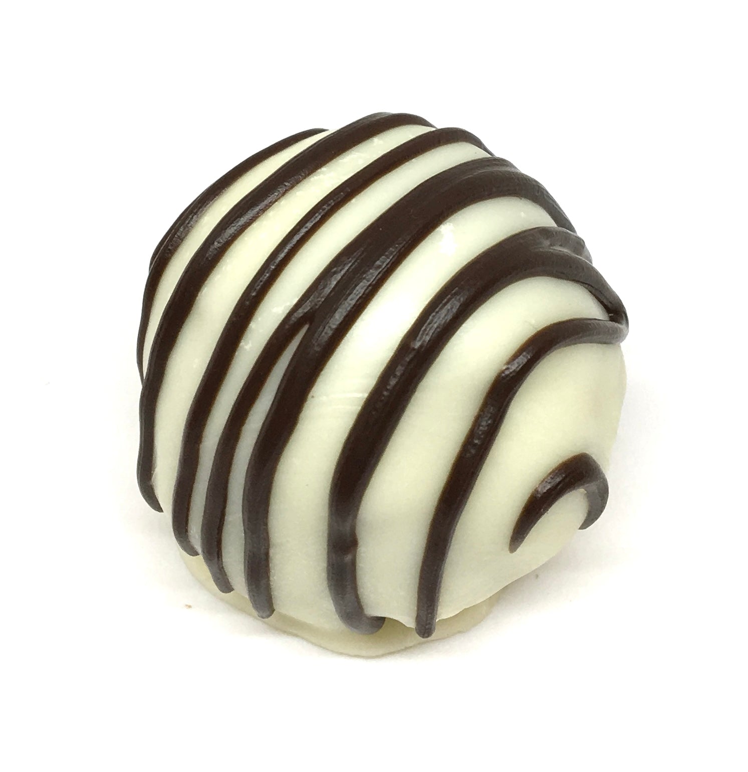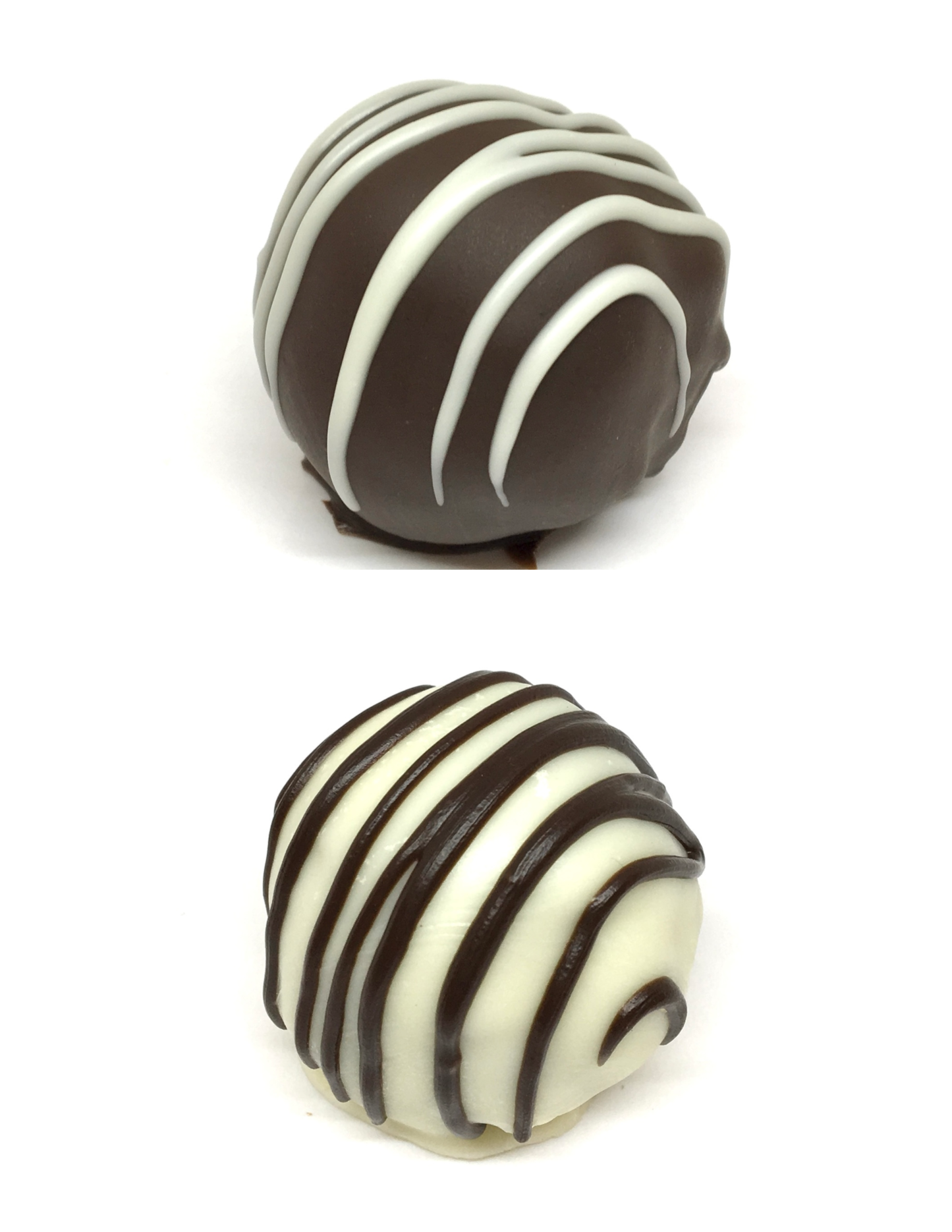 Once rolled, we double dip the bonbons in either white or dark chocolate, for a nice thick, chocolatey outer shell. Then we drizzle them with the opposite chocolate for a little additional beauty.