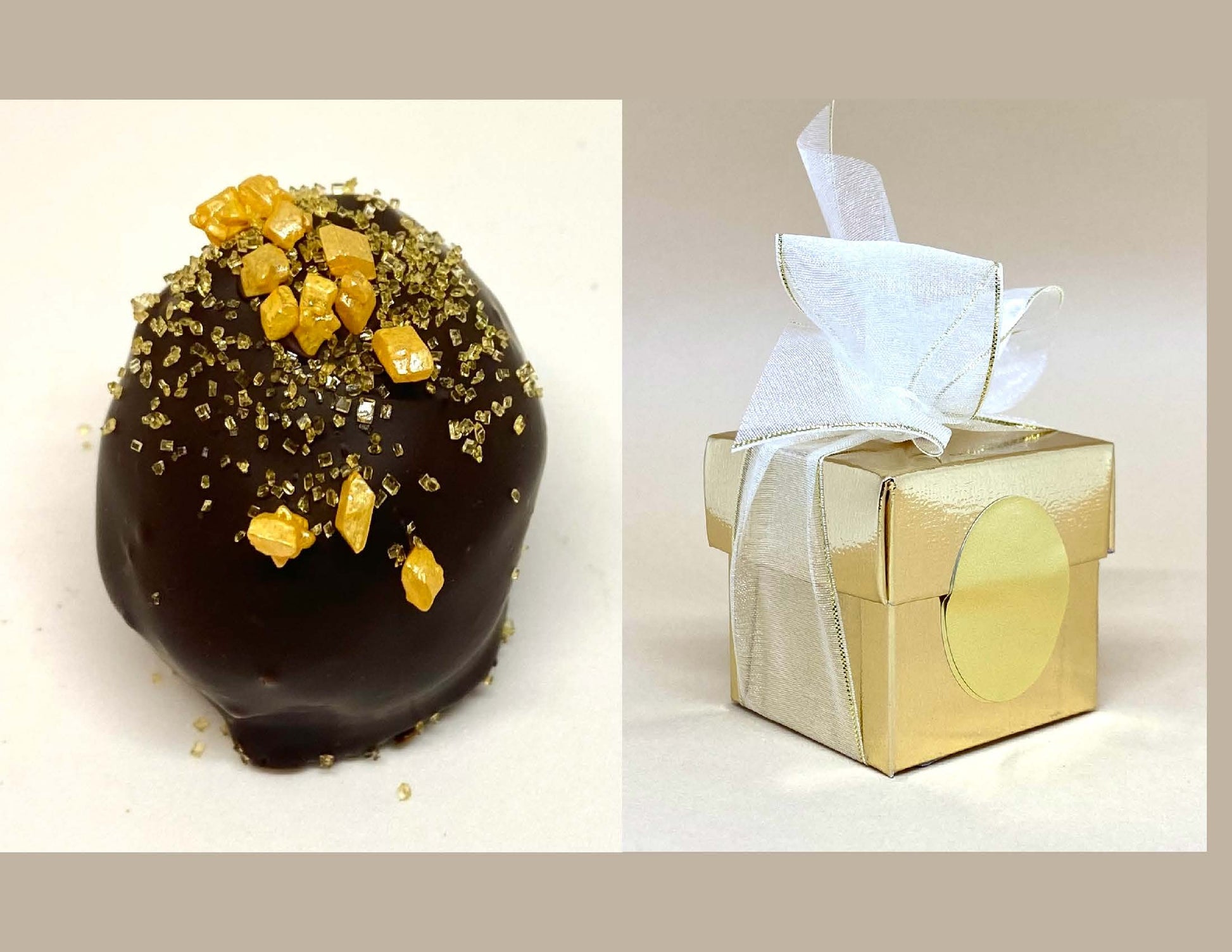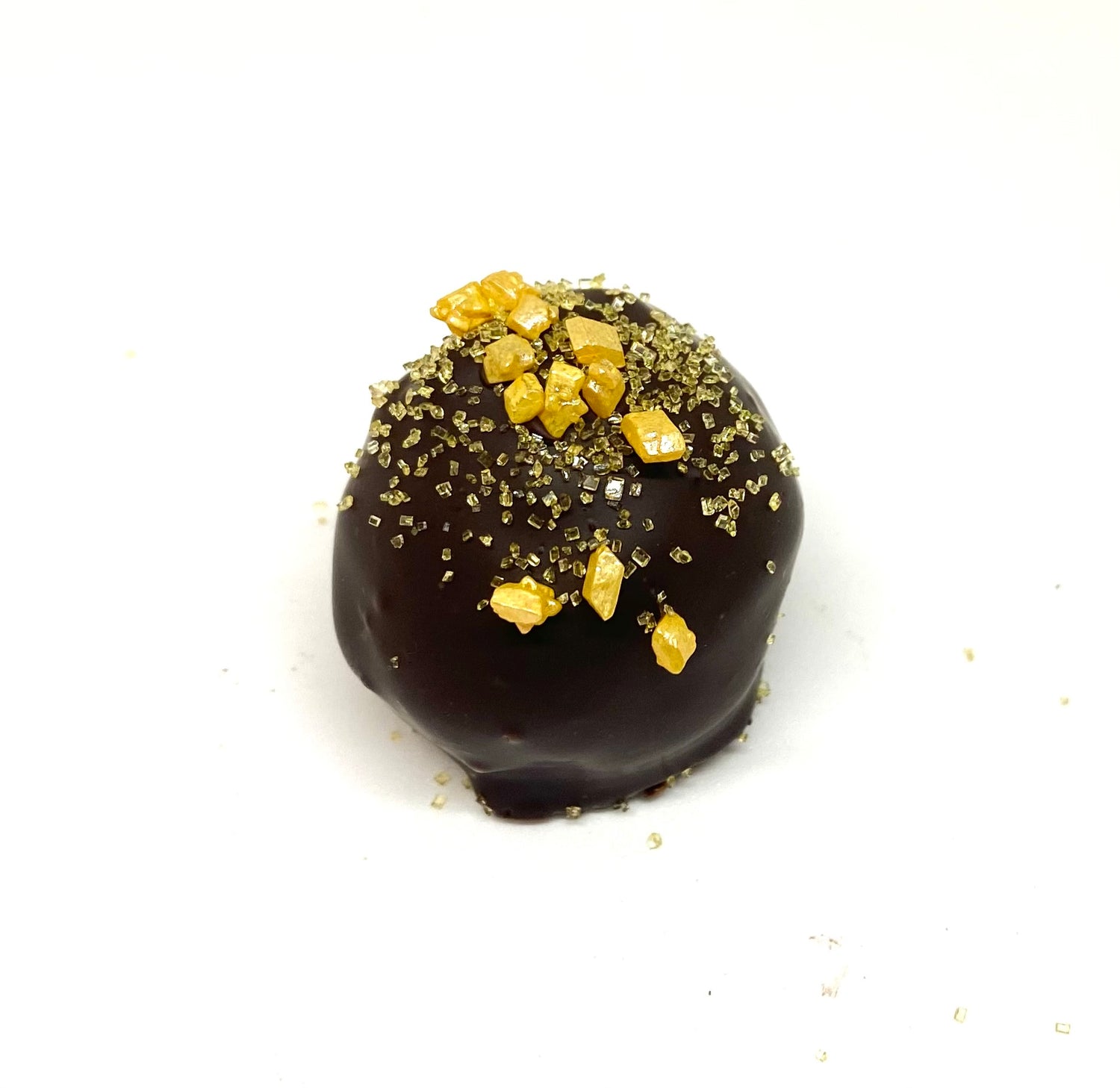 Our Chocolate Buttermint Brittle Bonbons are made from our super rich, super minty, Chocolate Buttermint Brittle. Our Chocolate Buttermint Brittle is rolled into bonbons, then double-dipped in our rich dark chocolate, flavored with natural mint. We then polish them off with gold sugar nuggets and a sprinkling of gold sugar.