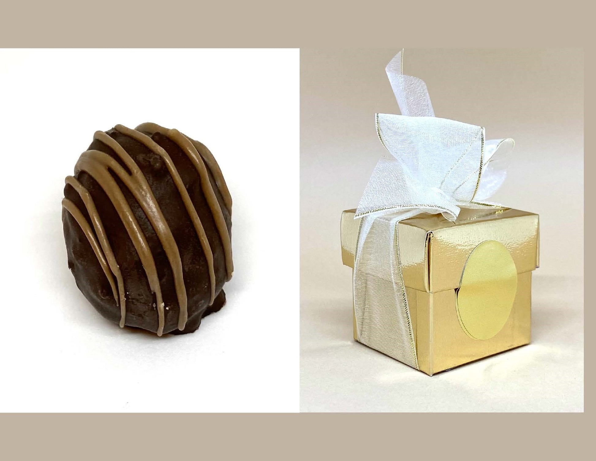 bonbons. We then double dip them in dark chocolate flavored with coffee, for a thick outer chocolate shell. Then we finish them off with a drizzled mix of white and dark chocolate, for a creamy, luscious experience!