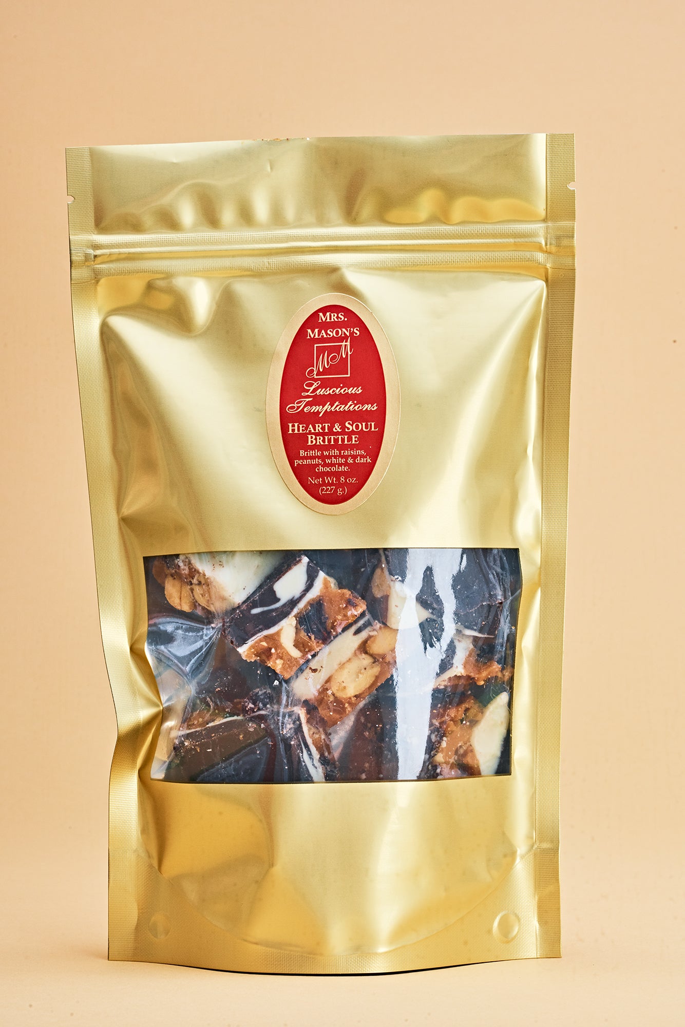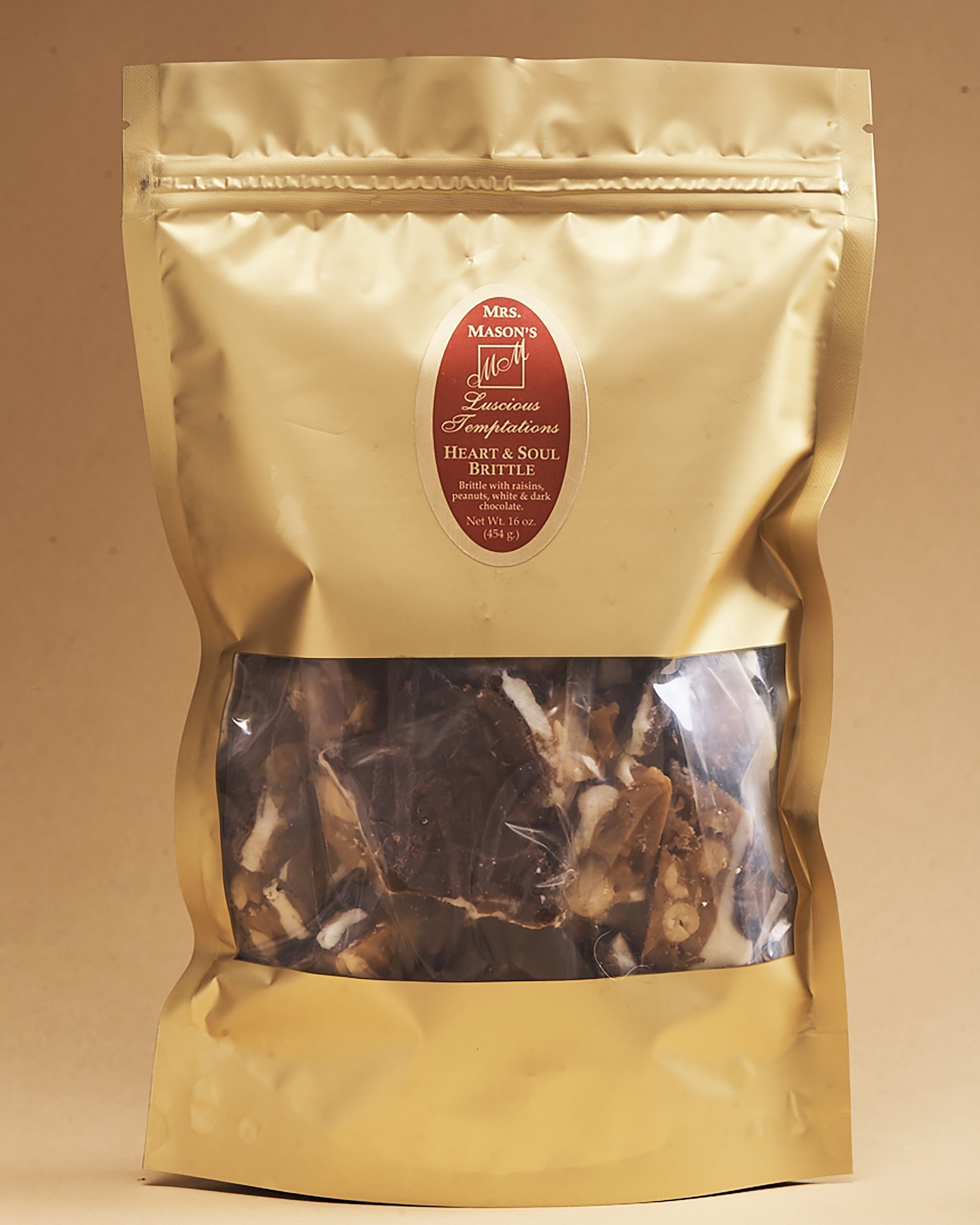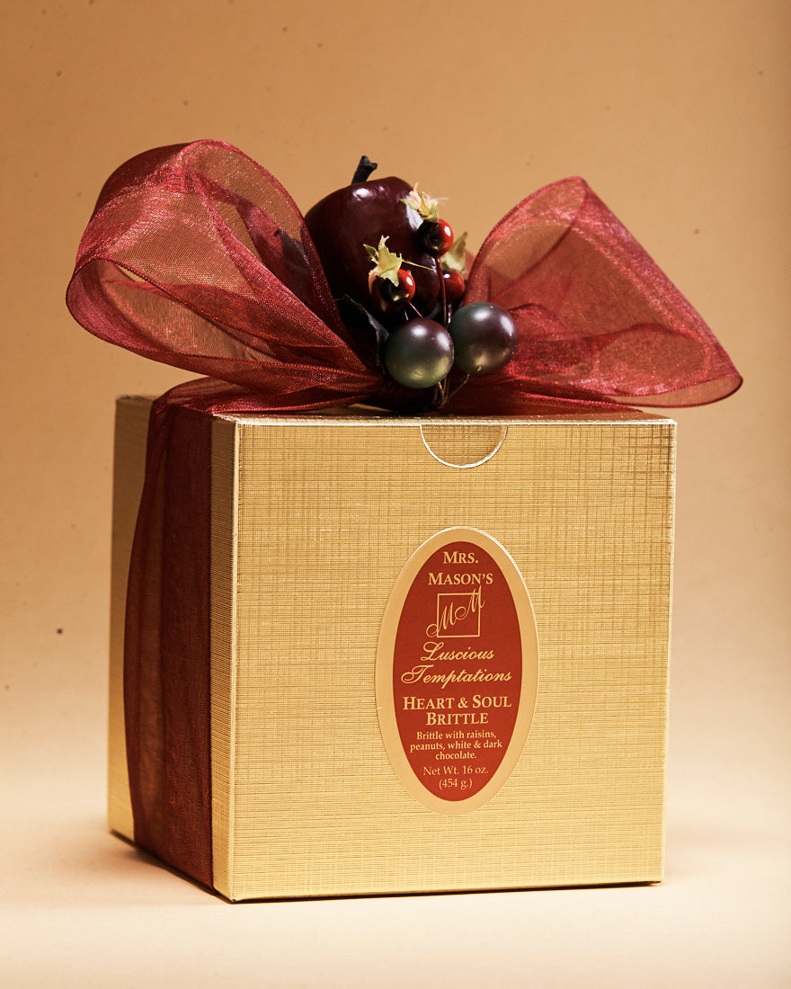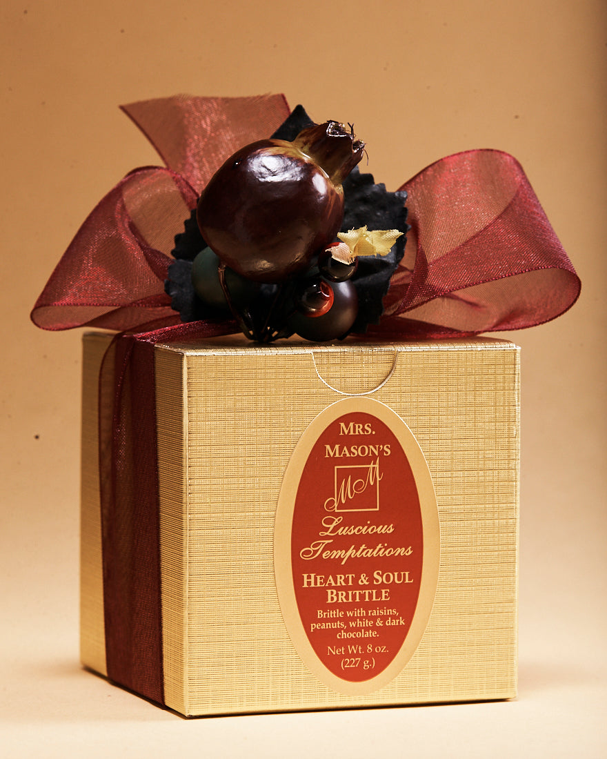 Mrs. Mason's Heart & Soul Brittle is an all time classic! We load our rich buttery base with whole, roasted and salted peanuts, plump juicy raisins, then top it off with a thick layer of white chocolate and another layer of dark chocolate!