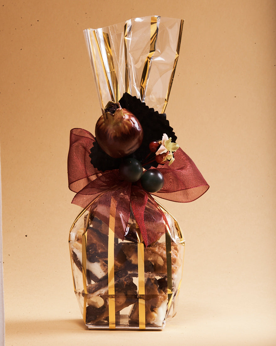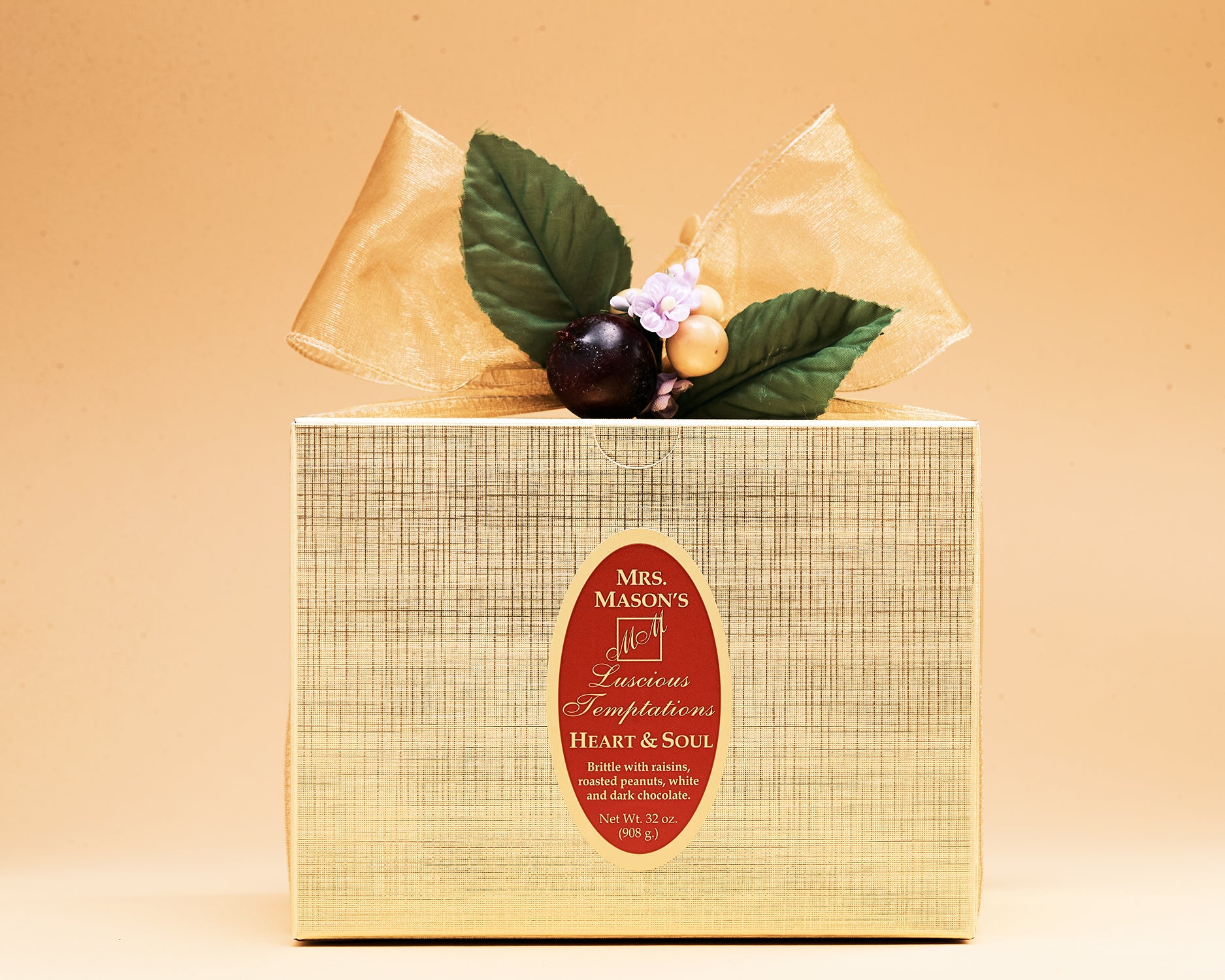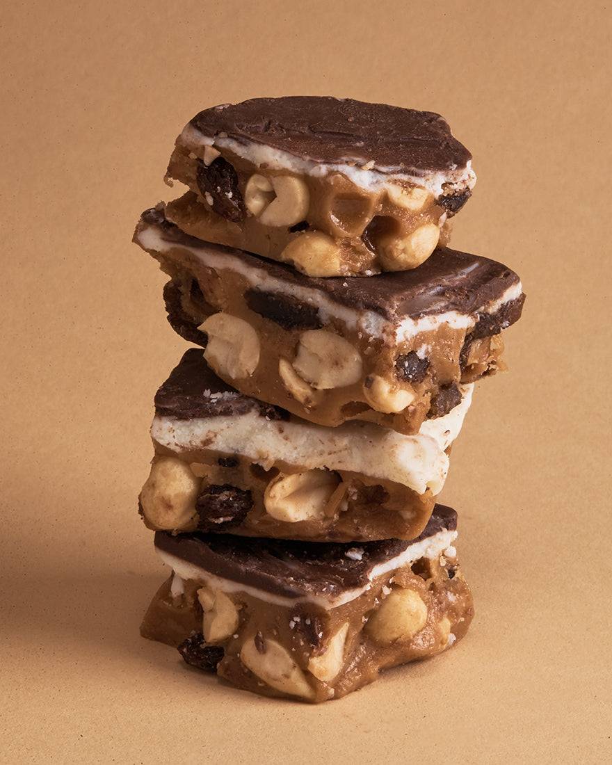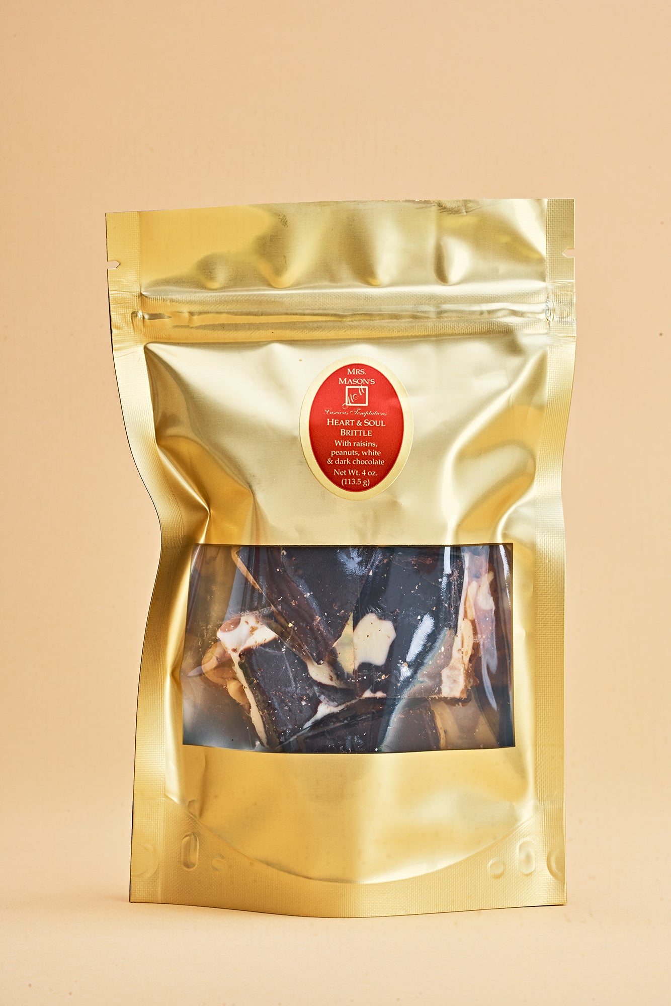 Mrs. Mason's Heart & Soul Brittle is an all time classic! We load our rich buttery base with whole, roasted and salted peanuts, plump juicy raisins, then top it off with a thick layer of white chocolate and another layer of dark chocolate!