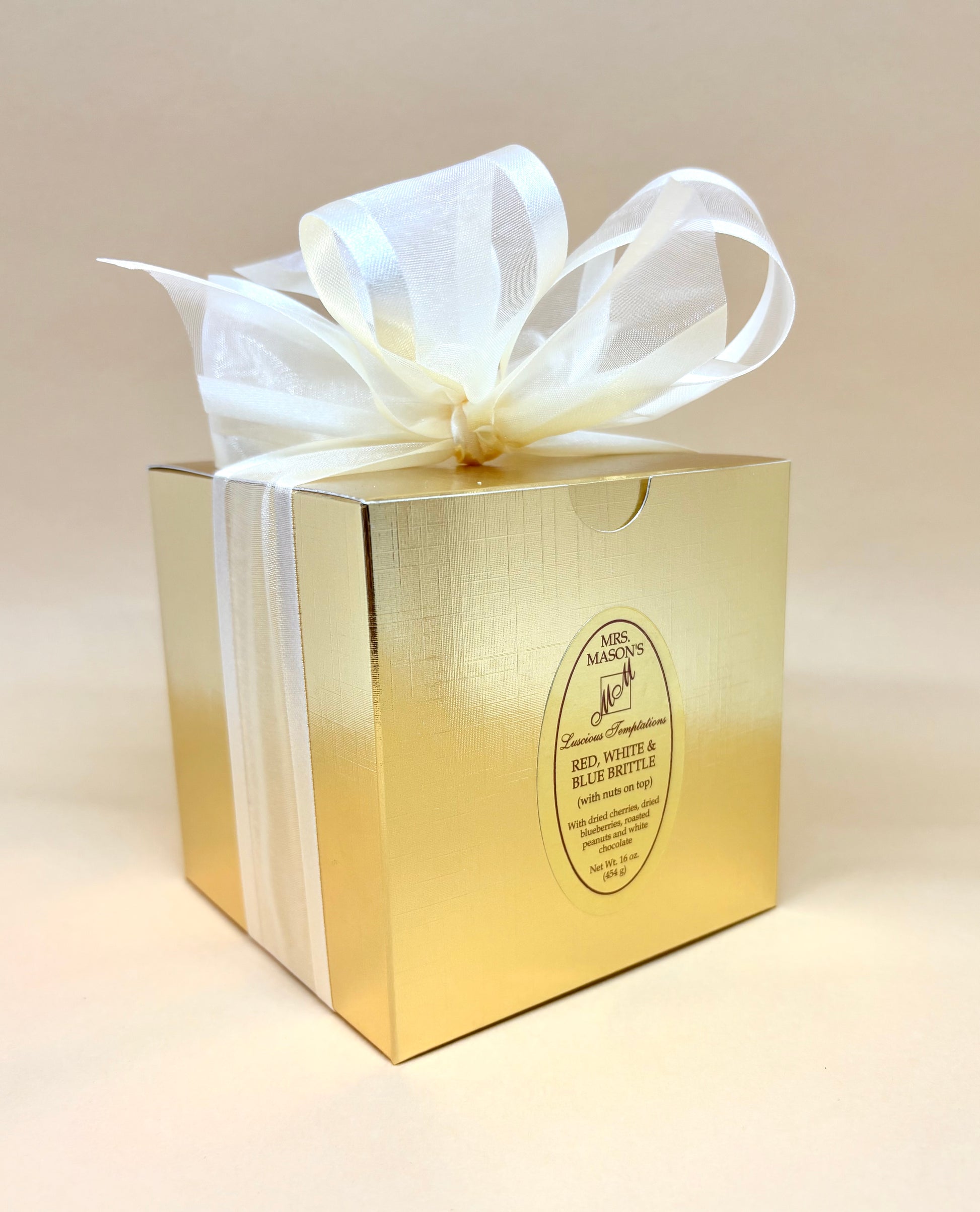 Our new Red, White & Blue Brittle (with nuts on top) is as American and as delicious as it gets. It's made with plump, dried Michigan cherries, dried blueberries, roasted and salted peanuts, topped with a thick layer of white chocolate, and of course a few nuts on top. Red, White & Blue may remind you of a wonderful PB&J experience, with a little bit of sweet crunch and a little bit of tart chewy! We know you're going to love it!