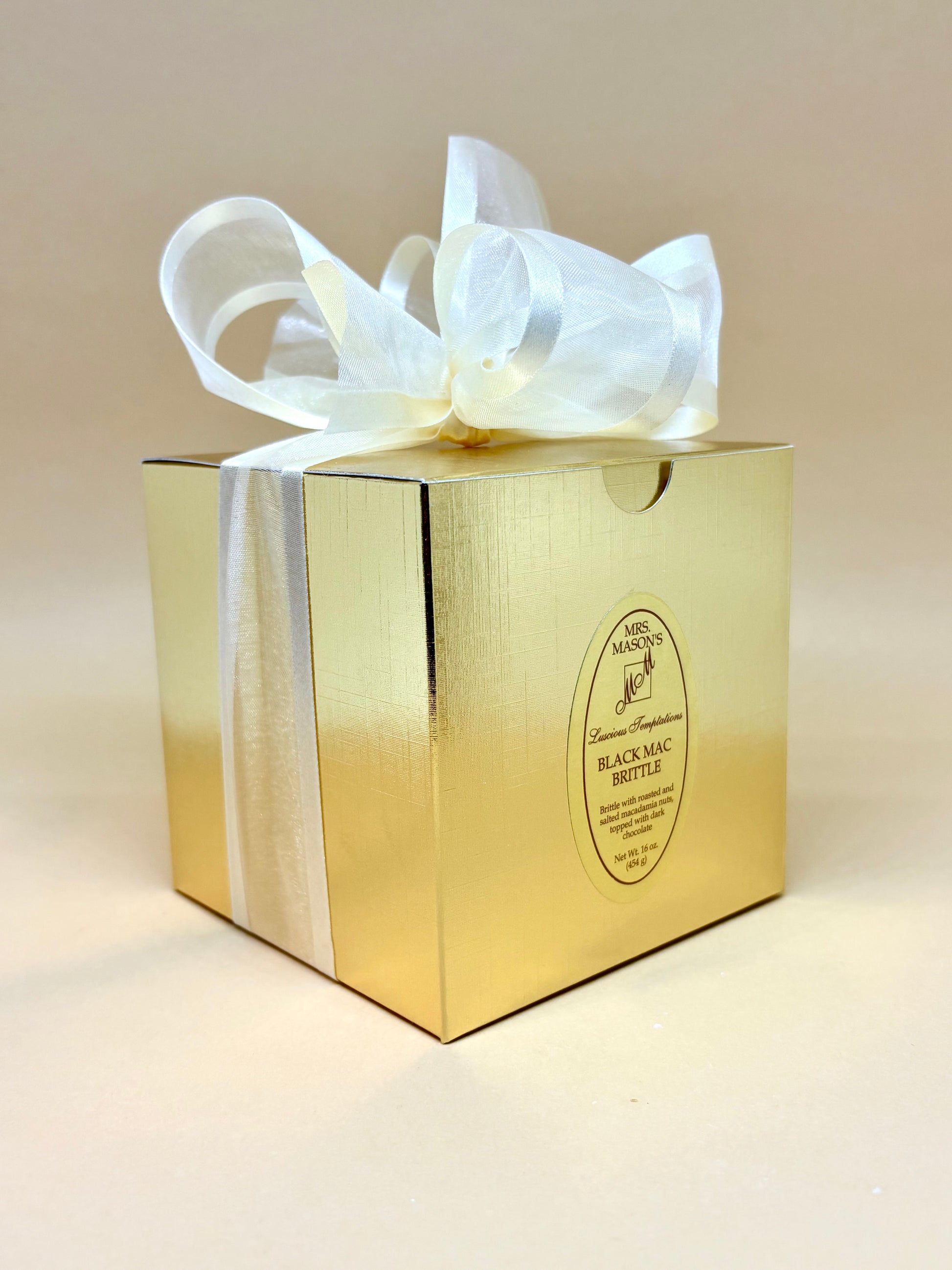 The return of the luscious! Our Black Mac brittle combines our rich buttery base with whole roasted and salted macadamia nuts, topped with a thick layer of dark chocolate. Rich and crunchy, sweet and salty!