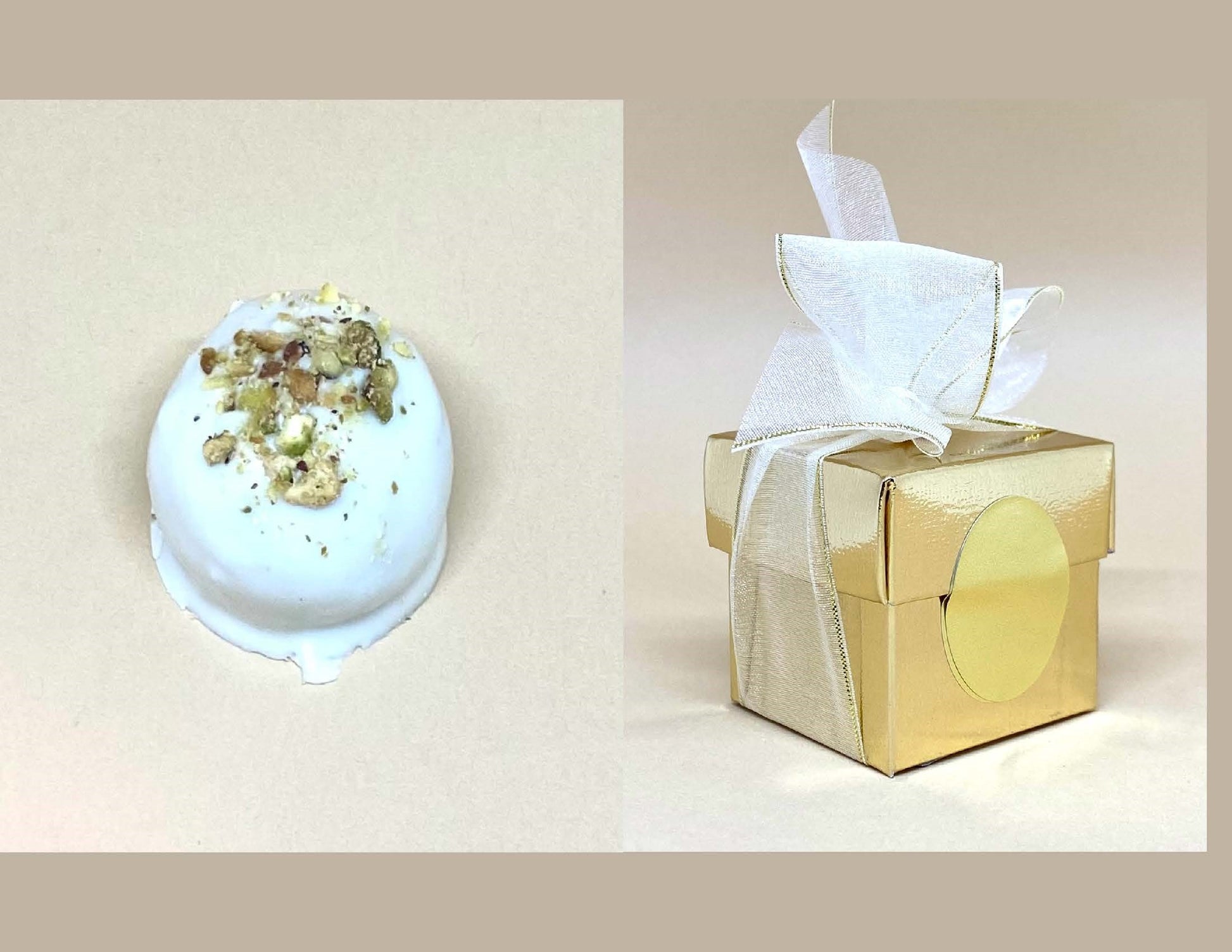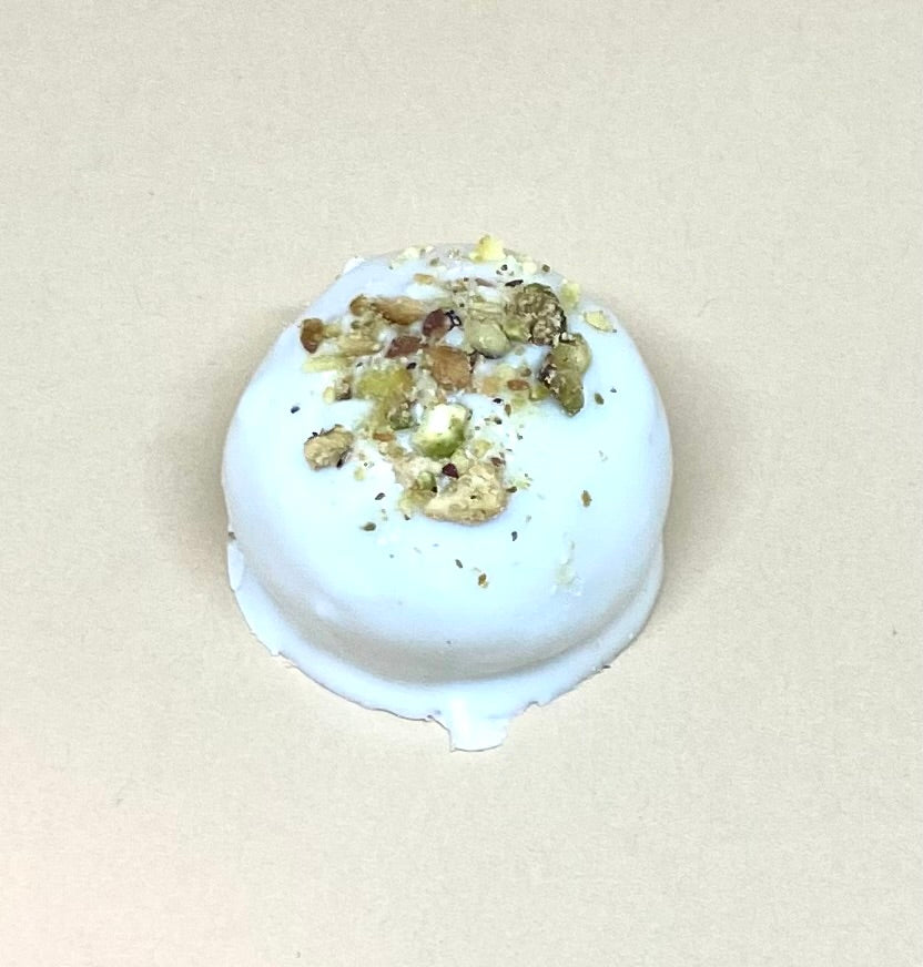 Our White Cherry Pistachio Brittle Bonbons are full of sweet, crunchy goodness! Made from our White Cherry Pistachio Brittle, which is full of roasted pistachios and plump cherries. These bonbons are crunchy in texture, until you hit that chewy, tart cherry.