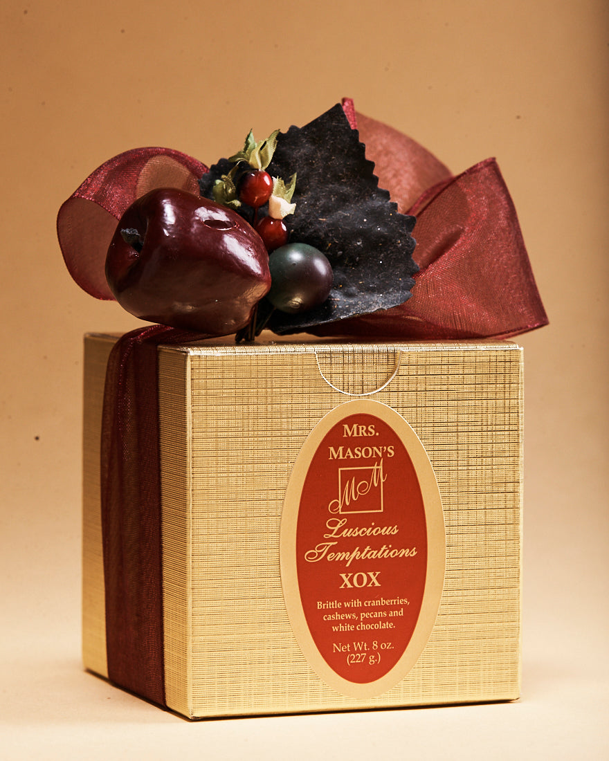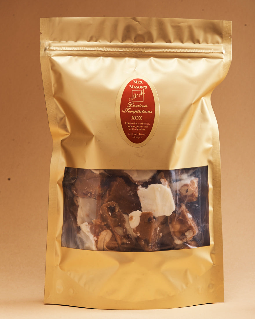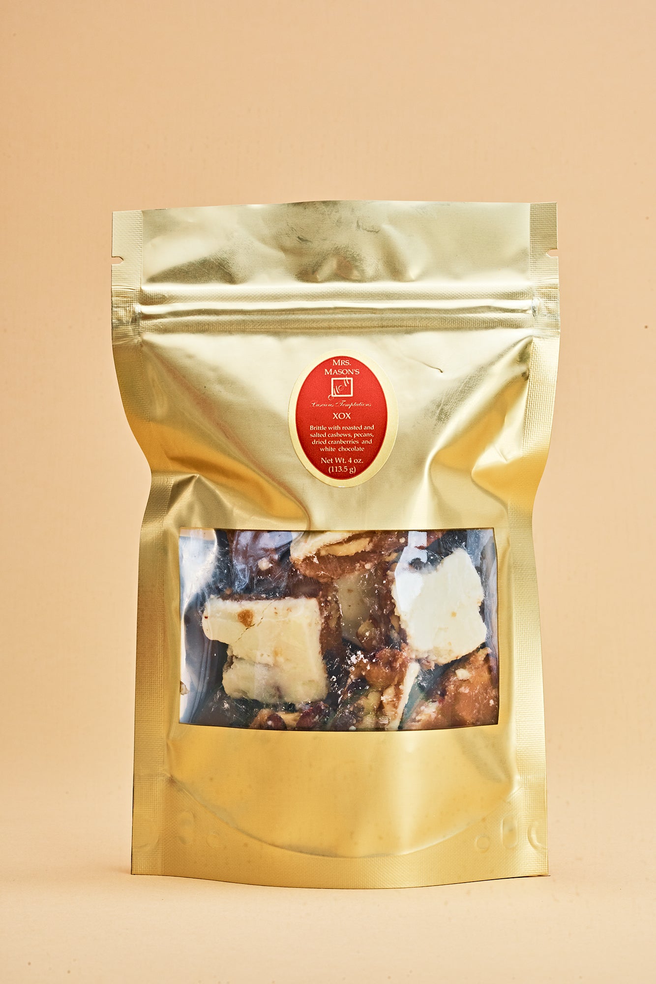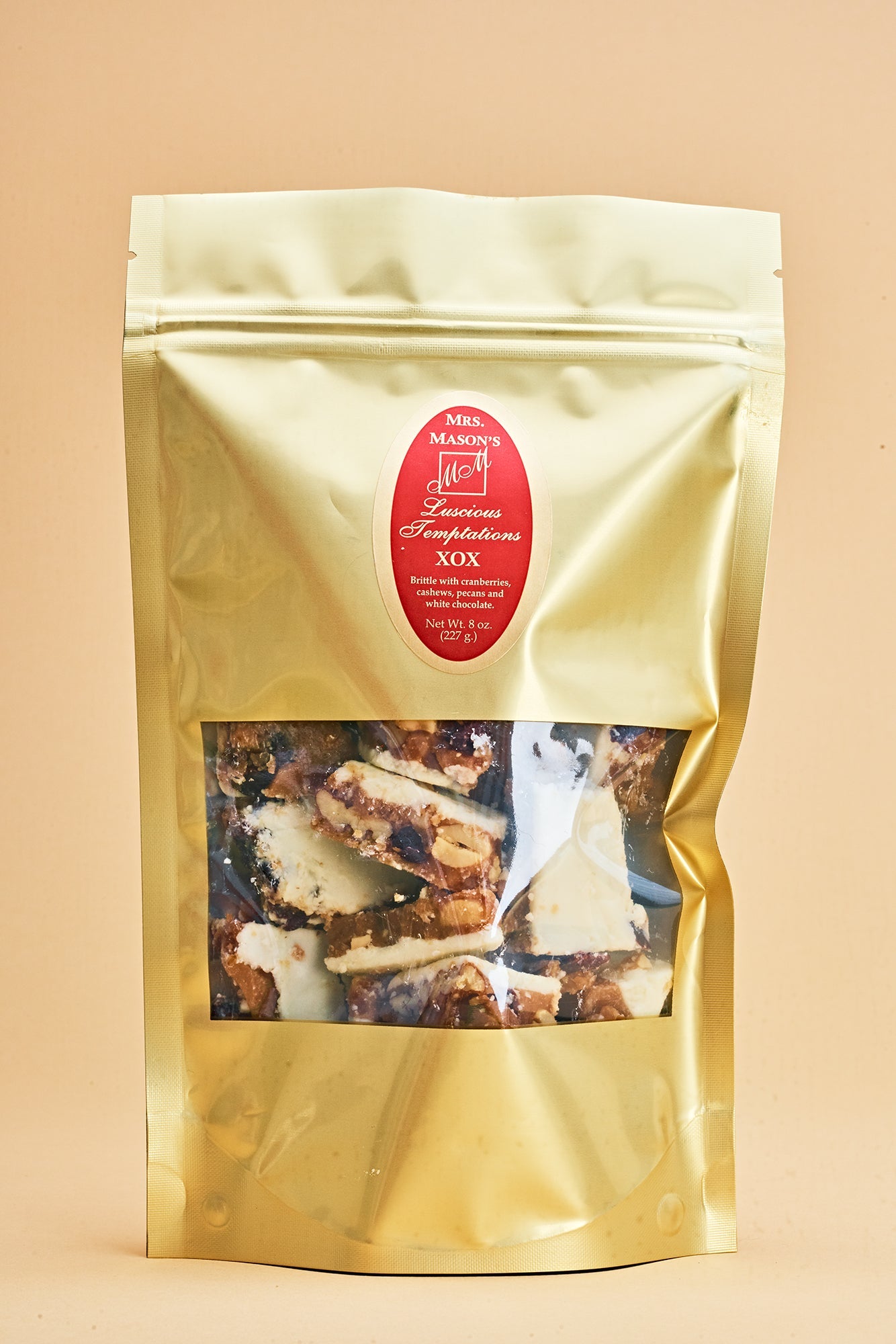 XOX is a unique wonder in our brittle collection! XOX is made with roasted and salted cashews, pecans and plump, dried cranberries. We blend all of that into our crisp, buttery brittle base, then top it off with a thick layer of white chocolate.