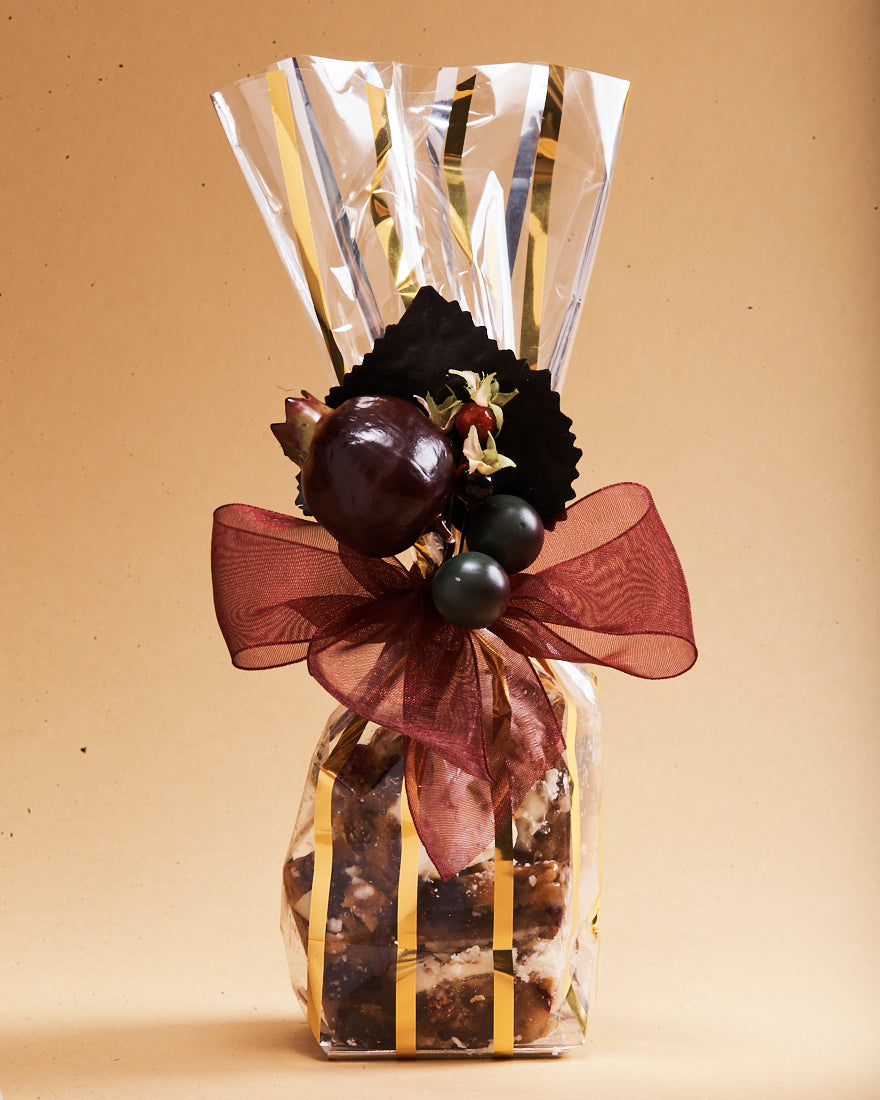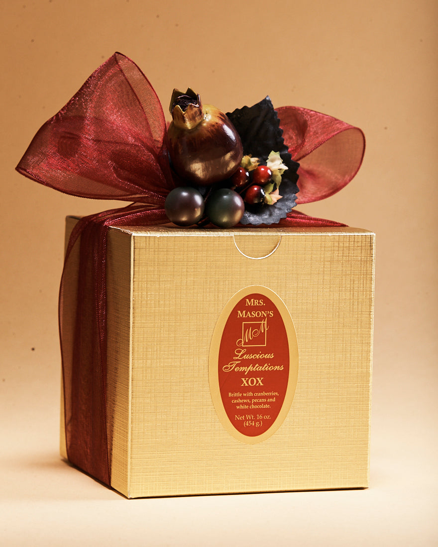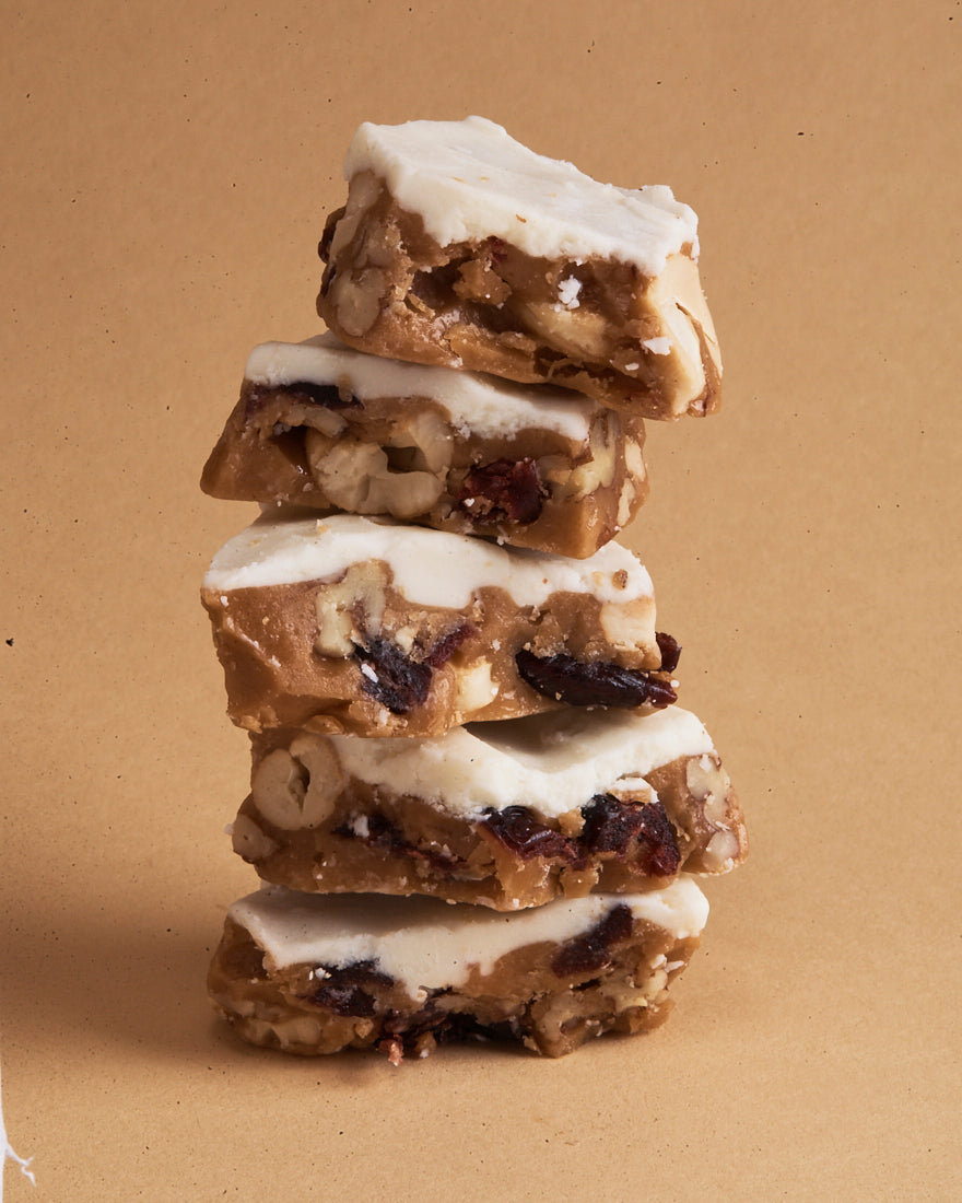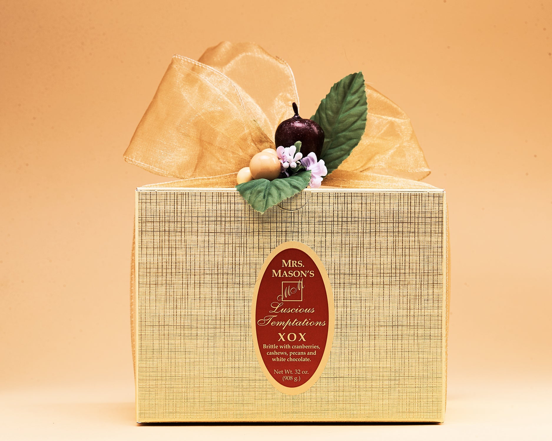 XOX is a unique wonder in our brittle collection! XOX is made with roasted and salted cashews, pecans and plump, dried cranberries. We blend all of that into our crisp, buttery brittle base, then top it off with a thick layer of white chocolate.